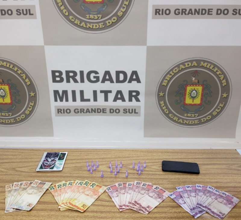 20 pinos de cocaína, uma caderneta com anotações, um celular e certa quantia em dinheiro.