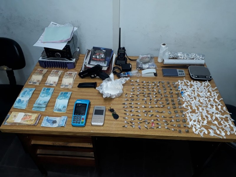 Ao total foi apreendido; um rádio transmissor na frequência da Brigada Militar, um carregador de rádio transmissor, diversos cadernos de anotações, 02 balanças de precisão, material para embalagem de drogas, 01 simulacro de arma de fogo (24/7), 01 faca, 93 porções maiores de cocaína, 35 porções de maconha, 80 porções menores de cocaína, uma porção de cocaína pesando aproximadamente 330g, duas máquinas de cartão crédito, um rádio veicular, um módulo veicular, uma prensa hidráulica (utilizada para comprimir e embalar a droga), um embalador, um capacete, um telefone celular, uma mochila preta, uma motocicleta e certa quantia em dinheiro.