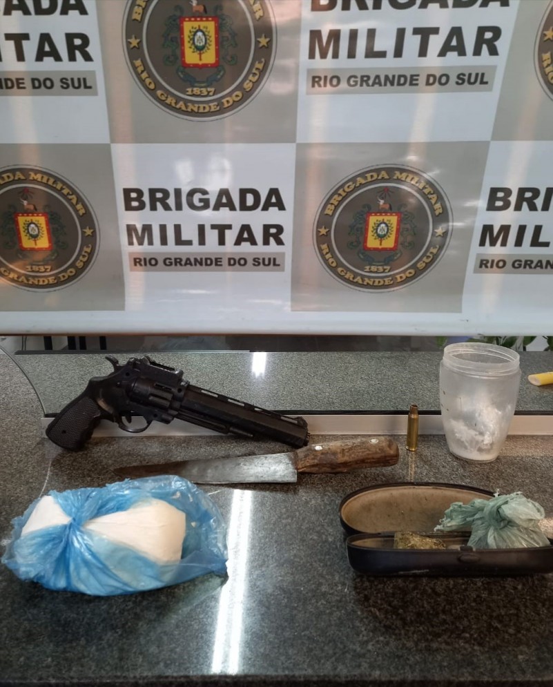 Foi apreendido com o acusado, um simulacro de arma de fogo utilizada para ameaçar, intimidar a vítima, uma faca, 02 porções de maconha, um estojo deflagrado calibre 7.62, 01 porção de cocaína pesando 250g e 03 celulares.
