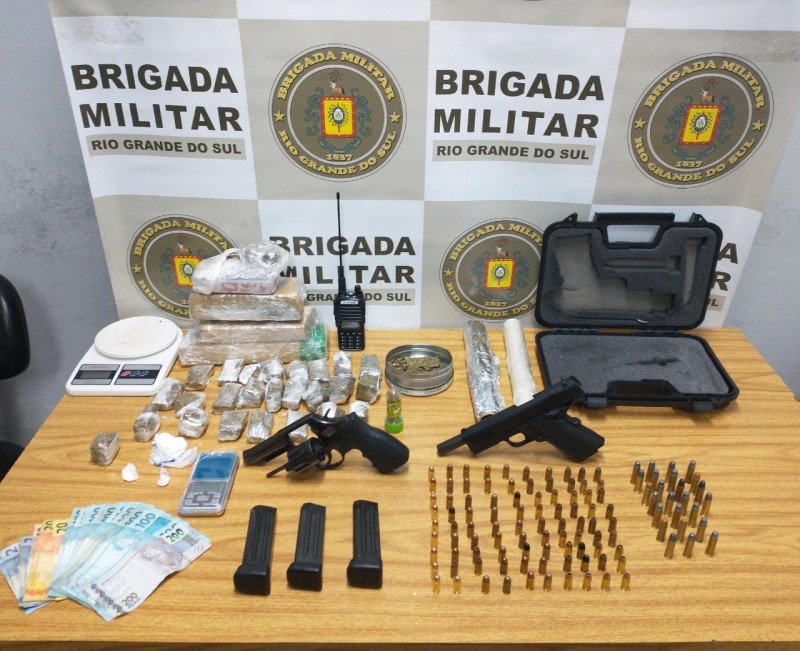 Após breve indagação ao preso o mesmo relatou que em sua residência haveria mais materiais ilícitos, sendo apreendida 01 porção de cocaína, 02 balanças de precisão, 01 rádio transmissor na frequência da Brigada Militar, 01 pistola marca Imbel calibre 380(em ocorrência de furto), 03 carregadores de pistola e certa quantia em dinheiro.