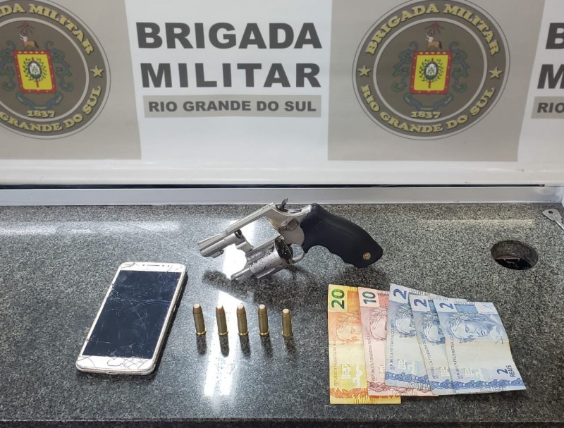 Também, no bairro Guajuviras foi preso um homem por porte ilegal de arma de fogo. Em revista pessoal foi apreendido um revólver marca Taurus, com 5 munições, um celular e certa quantia em dinheiro.