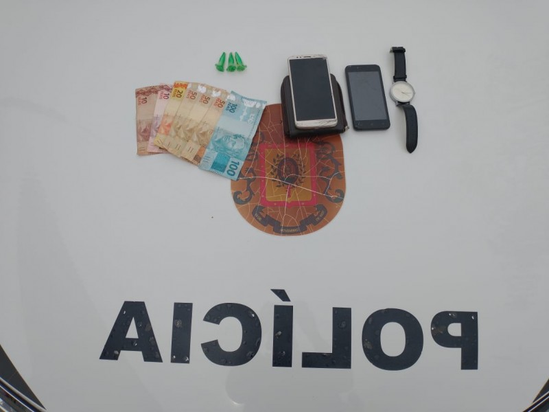 O individuo conduzia a motocicleta HONDA/C100 BIZ ES ano 2003 de cor verde adulterada, e estava de posse de três pinos plásticos de cocaína, dois celulares, um relógio e uma carteira contendo R$290,00 em moeda corrente.