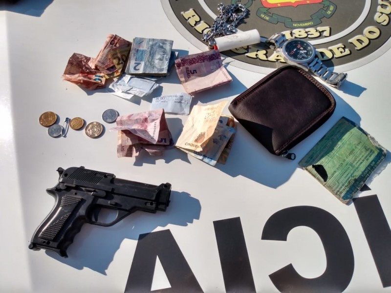 Com eles foram encontrados uma réplica de pistola, uma quantia em dinheiro e um aparelho celular. Também foi apreendida uma motocicleta utilizada pela dupla para cometer o crime.