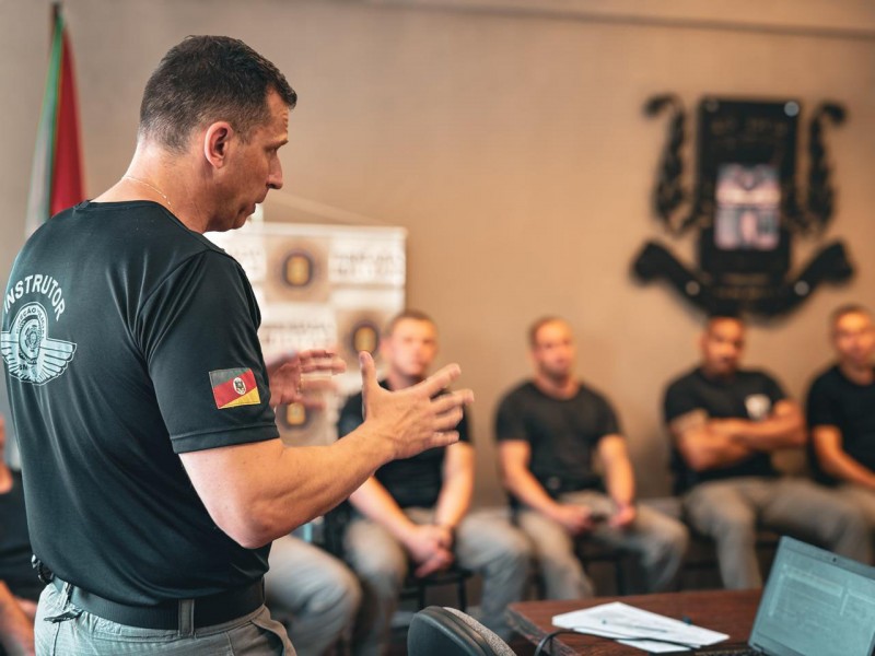 O instrutor, Major PM Juliano Antonio Giboski realizou na terça-feira (5/11), com a Força Tática do 25º BPM, a primeira fase da instrução teórica e prática do curso que tem por objetivo aprimorar o conhecimento sobre direção defensiva e controle na condução de viaturas policiais militares.