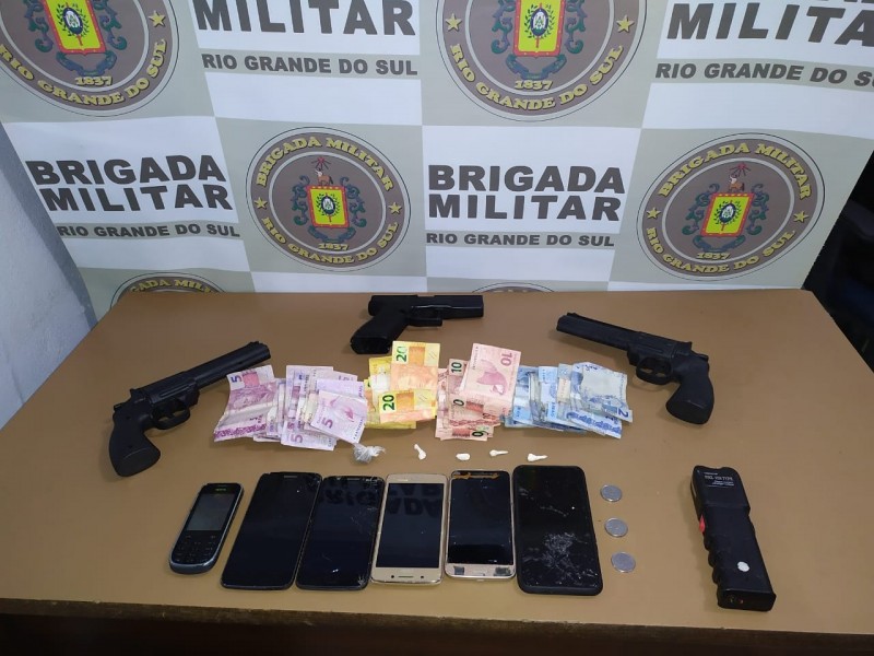 Durante abordagem os policiais apreenderam com o trio frações de crack, maconha, três simulacros de arma de fogo, um aparelho de choque, seis aparelhos celulares e dinheiro.