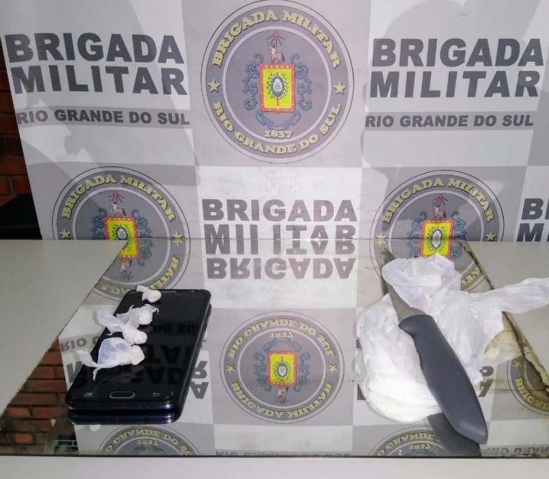 Diante da circunstância, a guarnição deslocou ao bairro Ponche Verde, onde realizou a abordagem do homem, que confirmou o relato do adolescente. Ainda, durante diligências, foram apreendidos um espelho e uma faca, utilizados para fracionar a droga.