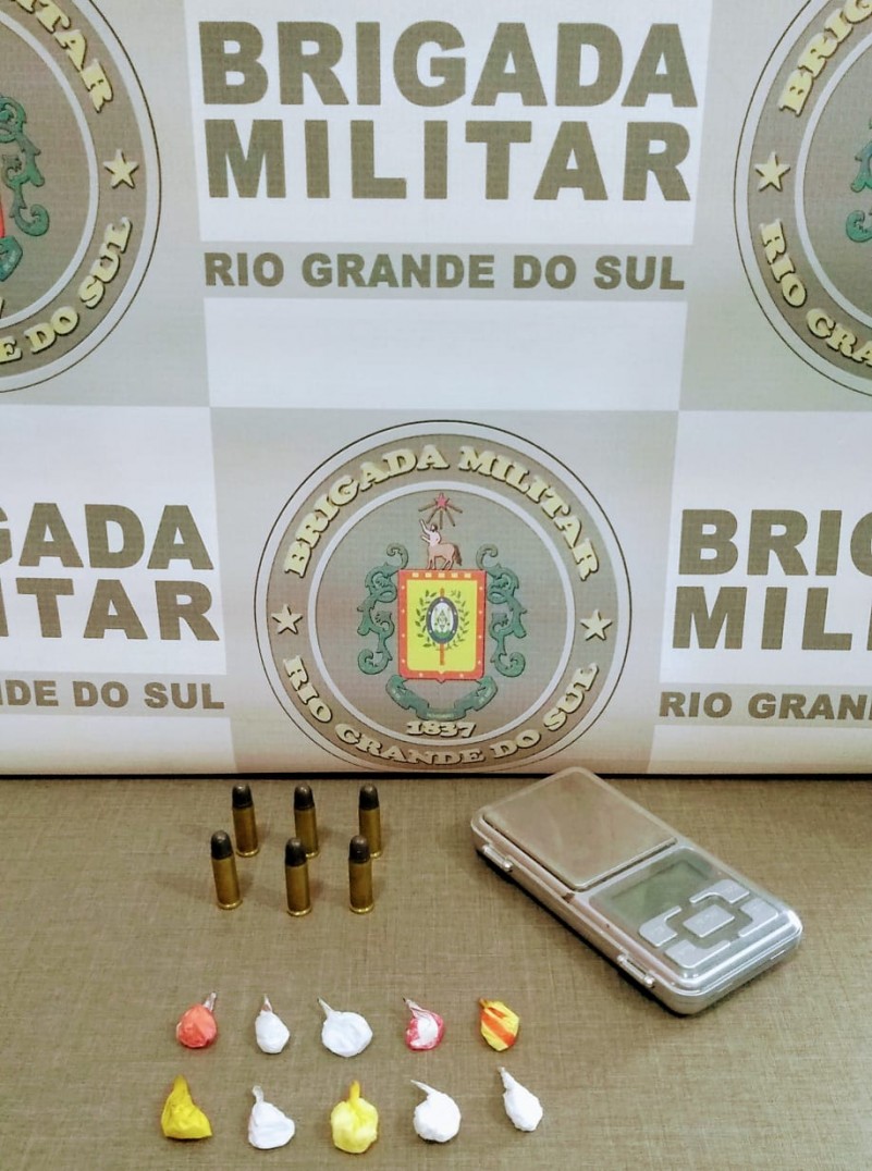 Durante o patrulhamento ostensivo, os policiais militares visualizaram um jovem em atitude suspeita . Com a aproximação da viatura, o jovem tentou fugir, mas logo foi abordado. Com ele, foram aprendidas dez buchas de cocaína, pesando 2,9 gramas. Ainda, durante diligências, foram apreendidas seis munições intactas calibre .32 e uma balança de precisão.