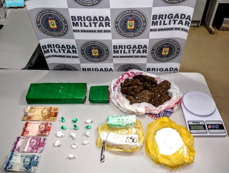 Durante ações de polícia ostensiva, os policiais militares procederam a abordagem de um veículo GM/ Celta. Mediante busca pessoal, com o condutor, foram apreendidas 13 buchas de cocaína, pesando 16 gramas. Ainda, durante busca veicular, foram apreendidas três porções de cocaína, pesando 509 gramas, um tijolo e diversas porções de maconha, pesando 1.709 gramas, uma colher de metal, uma balança digital e 67,00 reais em dinheiro.
