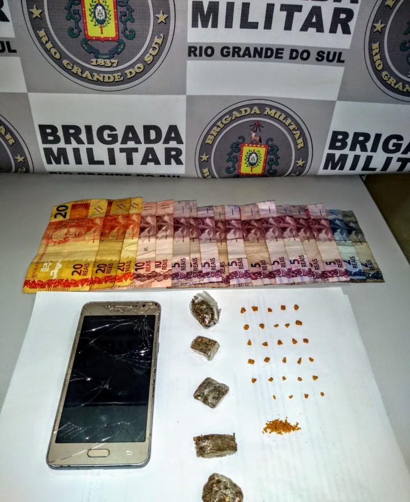Durante o patrulhamento ostensivo, os policiais militares receberam denúncia de traficância naquela região. Ao proceder a averiguação, a guarnição flagrou o homem entregando droga para um usuário, momento em que anunciou a abordagem. Através de busca pessoal foram apreendidas, com o homem, quatro porções de maconha, 29 pedras de crack, R$ 134,00 reais e um telefone celular. Já com o usuário, foi apreendida uma porção de maconha e uma porção de crack.