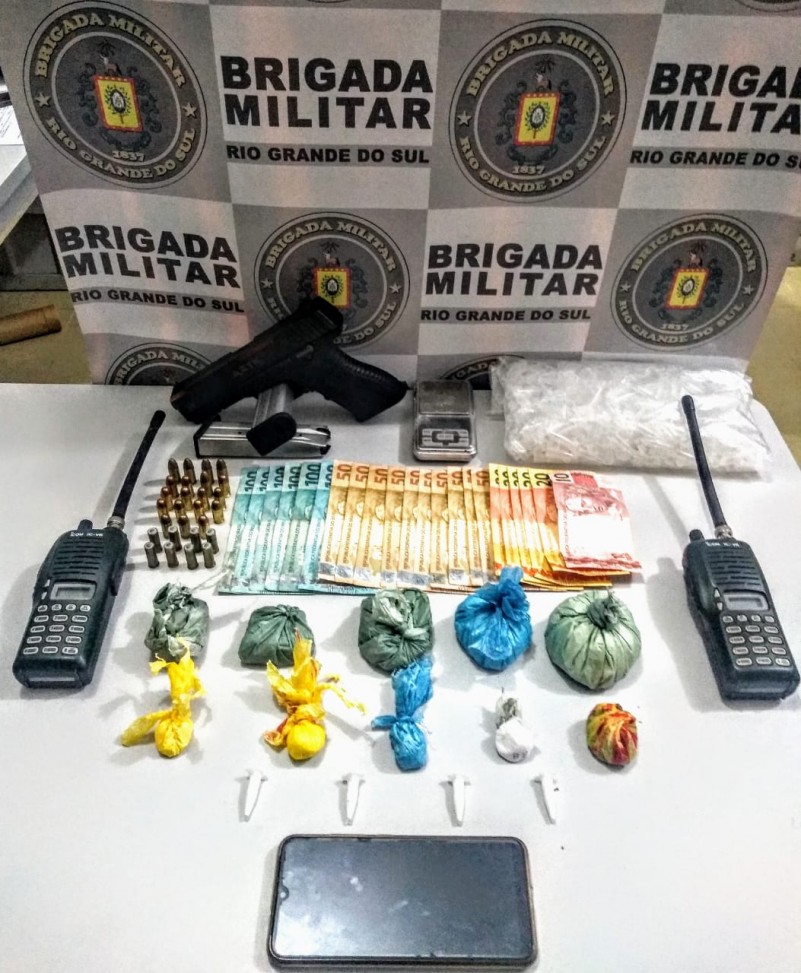No decorrer do patrulhamento ostensivo, os policiais militares flagraram o jovem, tripulando uma motocicleta em local conhecido como ponto de tráfico. Diante disso, procederam a abordagem e através de busca pessoal, em uma mochila que o abordado portava, foram apreendidas quatro porções de cocaína, duas porções de maconha, uma pistola calibre 9mm, com numeração suprimida, municiada com cinco cartuchos intactos e um rádio comunicador. Ainda, durante diligências, foram apreendidas, duas porções de cocaína, duas porções de maconha, uma balança digital, dinheiro, entre outros objetos.