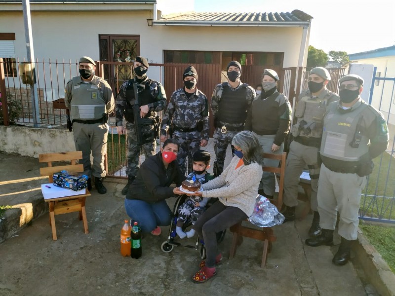 Desse modo, os policiais militares compraram um bolo, salgados, refrigerante e presente para o aniversariante. A viatura chegou na casa do garoto com sirenes e giroflash ligados, fazendo a alegria do pequeno. A admiração que Conrado sente pela Instituição ficou estampada em seus olhos, no momento em que viu as viaturas e os policiais militares chegarem em sua casa. Além dos presentes, o pequeno pôde entrar no carro da Brigada Militar e ganhou um bracelete do 35º BPM.