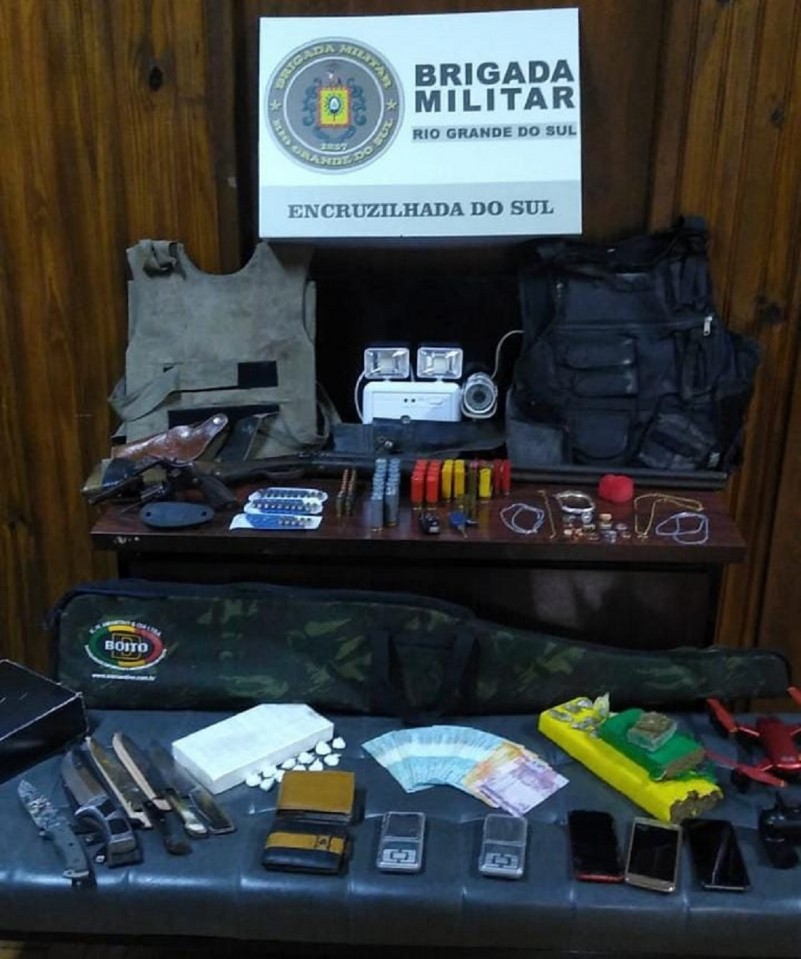 Na noite desta quarta-feira (23/6), no bairro Lava Pés, a BM de Encruzilhada do Sul apreendeu dentre outros objetos como munições, droga, coletes balísticos e dinheiro, uma arma de fogo roubada no assalto da agência bancária na cidade de Amaral Ferrador.