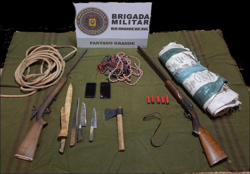 Na noite de quarta-feira (17/3), a Brigada Militar de Pantano Grande, prendeu três indivíduos de 19, 20 e 24 anos na localidade de Monte Castelo, onde segundo informações estaria circulando uma motocicleta e um automóvel que estariam envolvidos na prática de Abigeato. Foi realizado a abordagem de ambos veículos que tentaram fugir em direção a um sítio, sendo localizados os indivíduos e apreendidos 01 Rifle CBC calibre 22, 01 espingarda Boito calibre 16, 04 cartuchos intactos e 01 deflagrado, 02 telefones celulares, 03 cordas, 01 gancho para pendurar carne, 05 facas, 06 sacos plasticos, 01 machadinha e 01 porção de maconha. Diante dos fatos os três indivíduos foram presos e juntamente com o material apreendido e os veículos foram apresentados na Delegacia de Policia onde foi registrada a ocorrência.