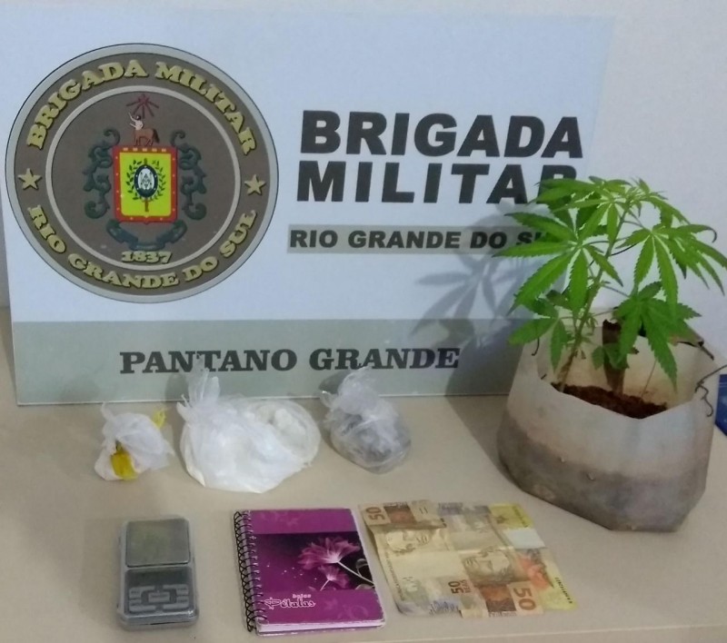 Na tarde de terça-feira(23/6), na localidade de Monte Castelo, a Brigada Militar de Pantano Grande prendeu um jovem de 25 anos, por tráfico de drogas. A prisão ocorreu, após policiais militares abordarem um veículo, com placas do município de Alvorada, que estaria na cidade para o serviço de transporte de um passageiro. Os policiais suspeitando do fato, seguiram o veículo até referida localidade. Ao chegar no endereço indicado, encontraram o jovem, o qual seria transportado pelo veículo, que resistiu a abordagem e tentou fugir, sendo contido, já no interior da residência. Na residência, foi localizado e apreendido um pé de maconha, 173 gramas de cocaína, 85 gramas de maconha, caderno de anotação do comércio de drogas, balança de precisão e R$120,00 reais. Diante dos fatos o indivíduo foi preso, encaminhado à Delegacia de Polícia para registro.
