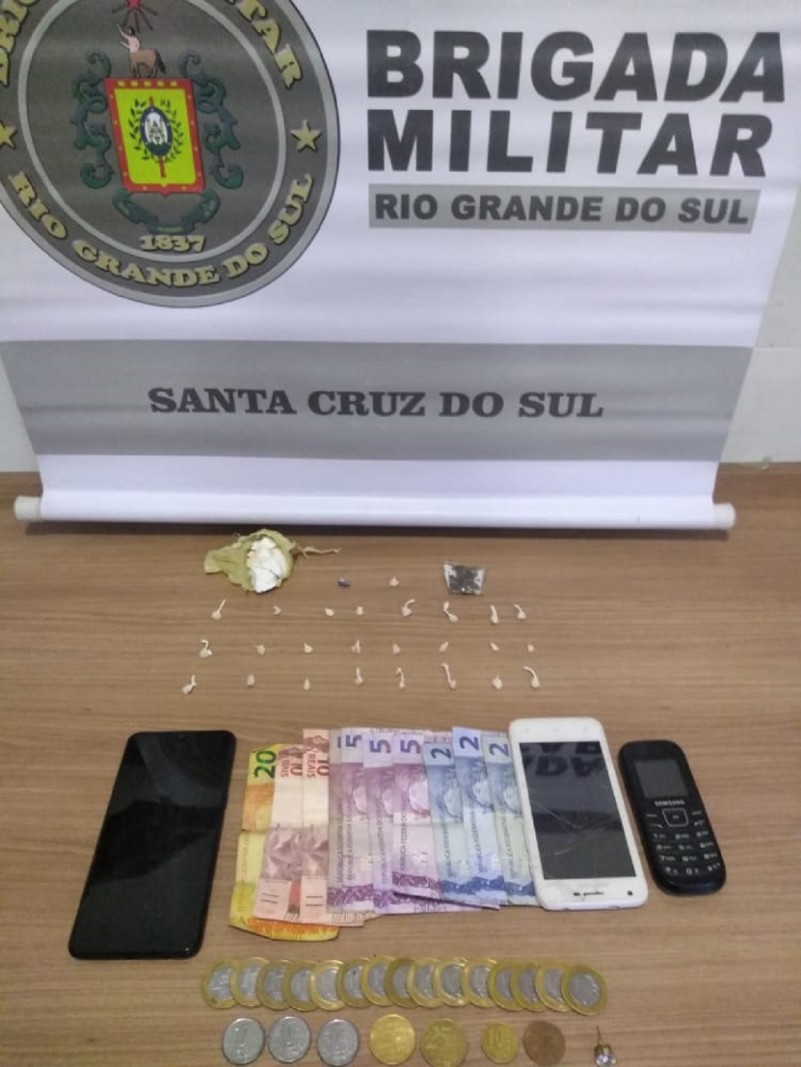 Na tarde desta terça-feira (2/2), Policiais Militares da Força Tática de Santa Cruz do Sul, juntamente com o Canil Regional, durante patrulhamento no Bairro Margarida, em local conhecido por comercialização de entorpecentes, flagraram um homem de 24 anos vendendo drogas a outro homem. Ambos os homens empreenderam fuga, tendo sido capturado o homem que estava vendendo os entorpecentes. Ele estava portando uma pochete contendo 26 pedras de crack, uma porção de maconha, anotações relativas ao tráfico , três celulares e a quantia de R$ 83,15 (oitenta e três reais e quinze centavos). Com a ajuda do cão farejador Radar, foi encontrado dentro de um tronco de uma árvore uma porção de cocaína pesando 20 gramas. Diante dos fatos, foi dado voz de prisão ao homem, sendo encaminhado à Delegacia de Polícia para a autuação do flagrante.