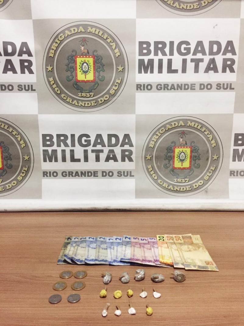 Durante ações de polícia ostensiva, foi flagrado a comercialização de drogas. Diante da circunstâncias, foi realizada a abordagem e a busca pessoal sendo encontrado quatro porções de cocaína com o abordado. Na sequência, foi realizada a abordagem a uma mulher que saía da residência com a qual foi encontrado R$ 156,00, cinco porções de cocaína e cinco porções de maconha.