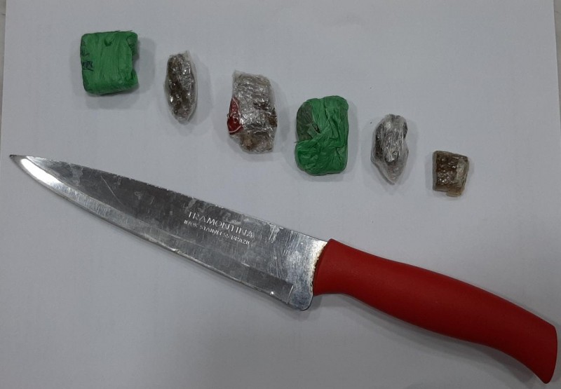 Durante diligências, foram apreendidos seis pacotes de maconha, pesando 20 gramas cada e uma faca.