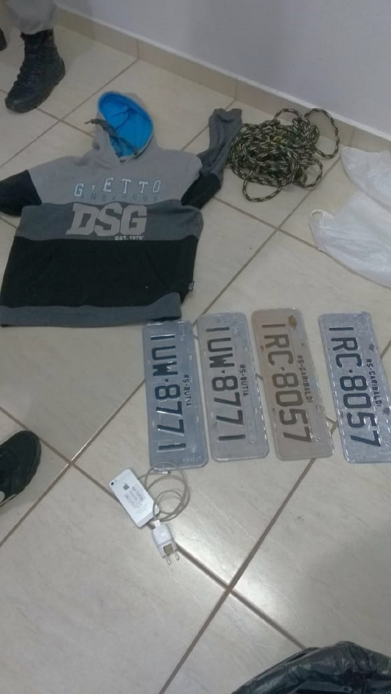 Os policiais militares receberam a informação de um veículo prata circulando em atitude suspeita, em um local conhecido como ponto de tráfico de entorpecentes. Ao efetuar a averiguação, a guarnição localizou o veículo, VW Voyage, e procedeu as diligências. Diante disso, foi constatado, pelo chassis, que o veículo estava em ocorrência de roubo desde o dia 23/09/20, ocorrida no município de Porto Alegre e, além disso era clonado. Além das placas anexa ao veículo, no interior do automóvel foi apreendido outro par de placas, um moletom com capuz, uma corda, e um telefone celular.