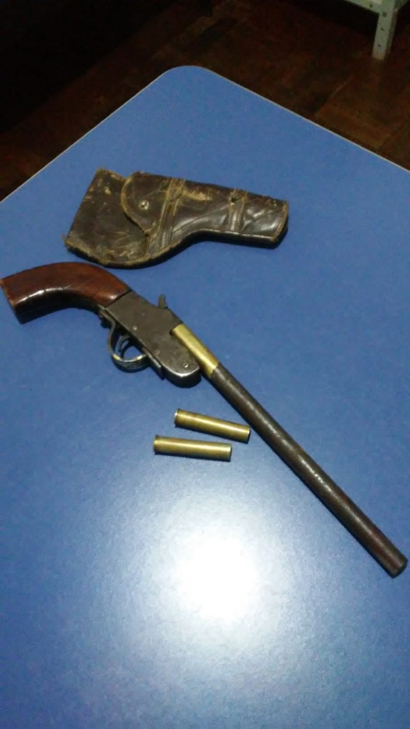 No local, policiais encontraram o homem, o qual carregava consigo uma pistola calibre. 36, sem marca visível, com dois cartuchos, um intacto e outro deflagrado.