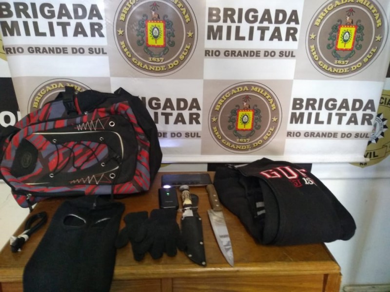 No interior do veículo os policiais encontraram diversos materiais como balaclava preta, facas, celulares e a vítima os reconheceu como autores do fato.