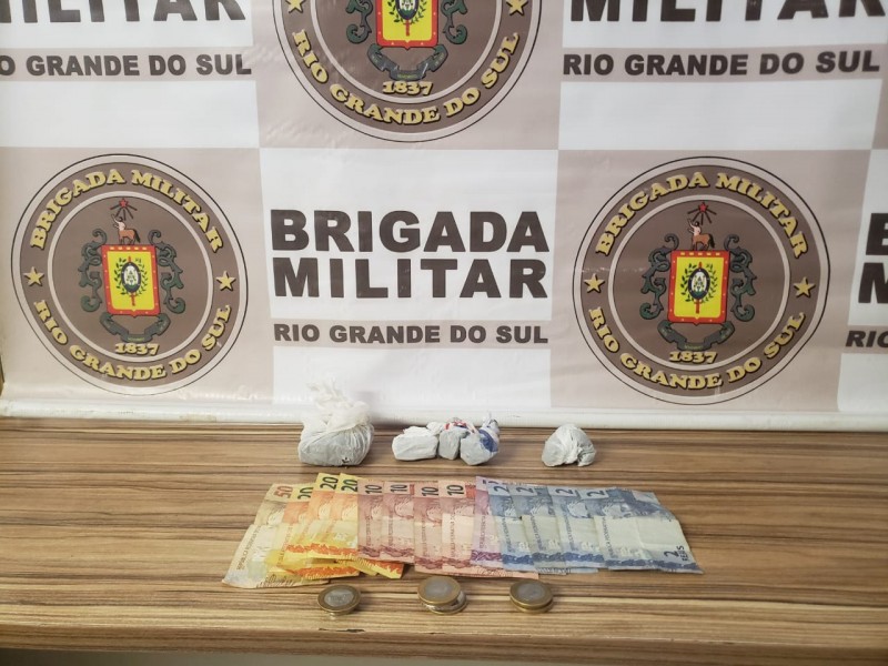 Durante patrulhamento em um local conhecido pela prática de tráfico de drogas no loteamento Salvador Faraco, os policiais viram dois indivíduos em atitude suspeita em uma parada de ônibus, os quais ao perceberem a presença policial demostraram inquietação. Os policias realizaram a abordagem dos indivíduos e localizaram com eles cinco porções de maconha e R$171,50 em dinheiro trocado.
