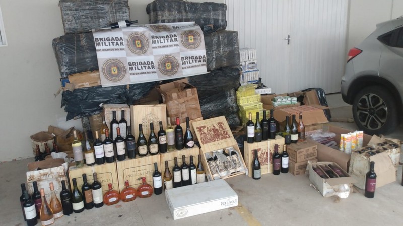 Após informações levantadas que em um endereço havia chegado uma carga de produtos oriundos de descaminho vindos da Argentina, as guarnições da Hórus Patrulha Comercial e Rocam deslocaram para verificar. Lá foram encontrados diversos produtos de procedência argentina, como bebidas, desodorantes, medicamentos além de uma motocicleta em situação de furto, quatro revólveres, munições e dinheiro.