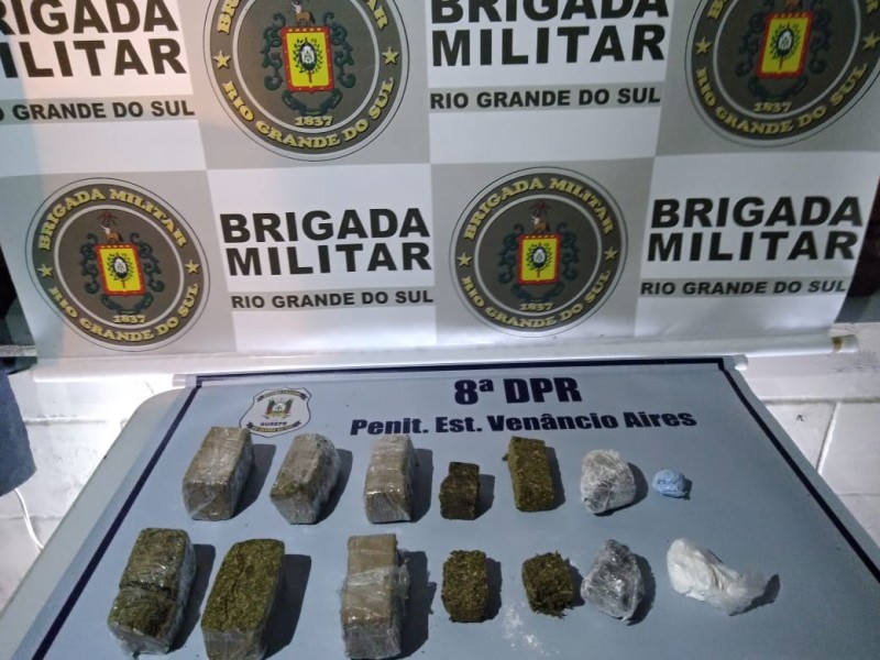 Na noite de sábado (13/3), às 21h20, a Brigada Militar de Venâncio Aires apreendeu entorpecentes no Presídio Estadual de Venâncio Aires (PEVA). A guarda externa da Brigada Militar do Presídio Estadual de Venâncio Aires avistou dois individuos em atitude suspeita. Foi feita averiguação e foram localizados, na área externa do presídio, oito tijolos de maconha, totalizando 927,1 gramas e quatro invólucros, contendo 210,8 gramas de cocaína.