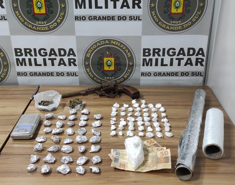 Durante ações de polícia ostensiva e diligências realizadas próximo a um local conhecido pela traficância de drogas, a Brigada Militar apreendeu um revólver calibre .38, um caderno com anotações, uma balança de precisão, 39 porções de maconha (79,1 gramas), 51 porções de cocaína (137,2 gramas), R$ 150,00 em espécie, um rolo de papel alumínio e um rolo de sacos plásticos. No local da apreensão estavam dois homens, um de 20 anos e um adolescente de 17 anos, sendo que o último assumiu a propriedade do material apreeendido.