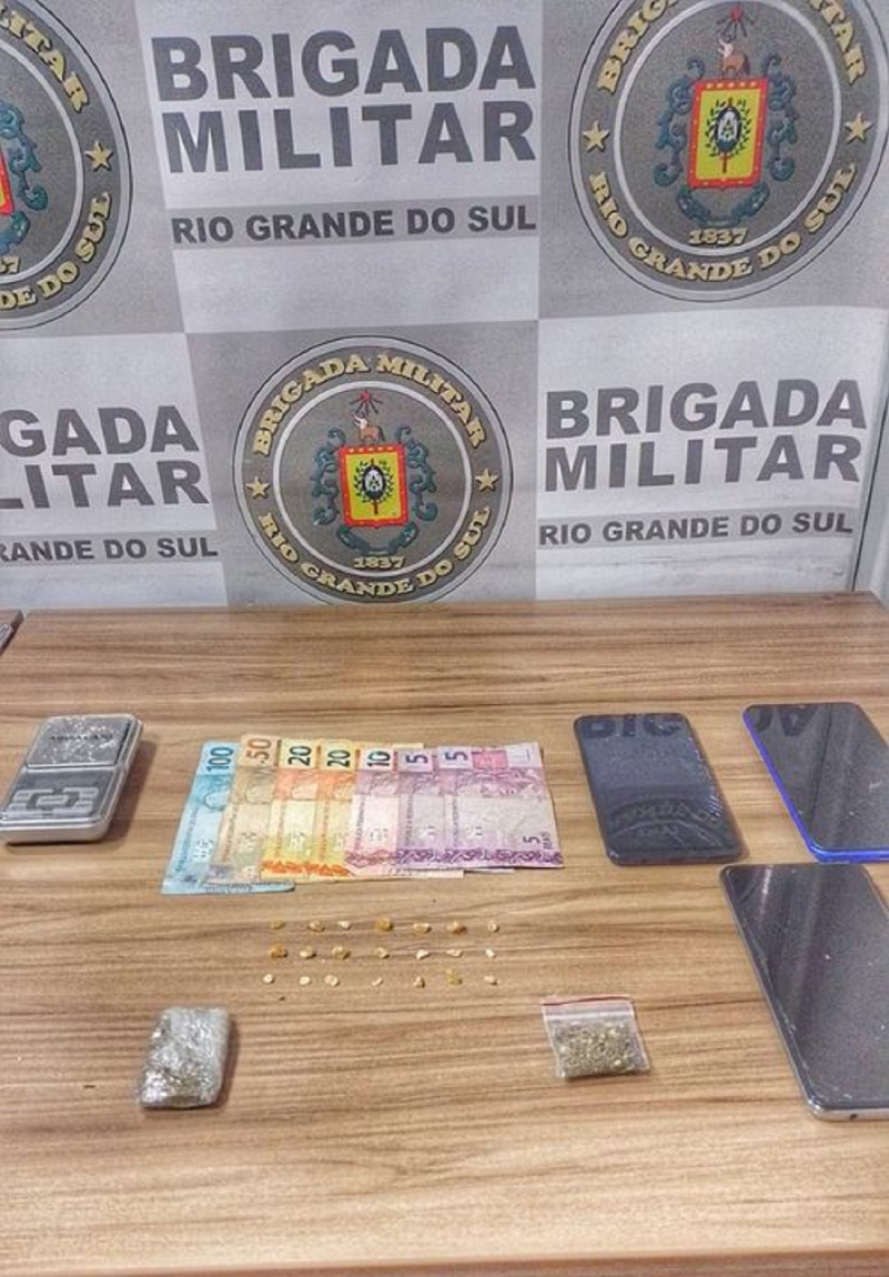 Durante ações de polícia ostensiva, um homem de 40 anos foi abordado próximo a um local conhecido pela traficância de entorpecentes e com ele encontrado uma pedra de crack. Após diligências no local, foi encontrado o restante da droga apreendida, a qual estava na posse do homem de 23 anos. A Brigada Militar apreendeu duas porções de maconha, 19 porções de crack, uma balança de precisão, R$ 210,00 e três aparelhos celulares.