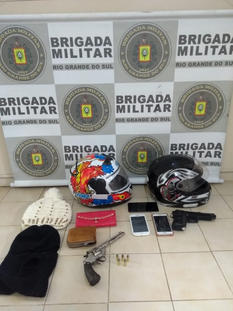 Nas proximidades do Lago Dourado, os três indivíduos, foram abordados e em revista pessoal, foi encontrado e apreendido um revólver calibre .38 com cinco munições intactas e um simulacro de arma de fogo (pistola). Além disso, realizada a apreensão de duas toucas, três aparelhos celulares, dois capacetes e duas carteiras com documentos diversos.