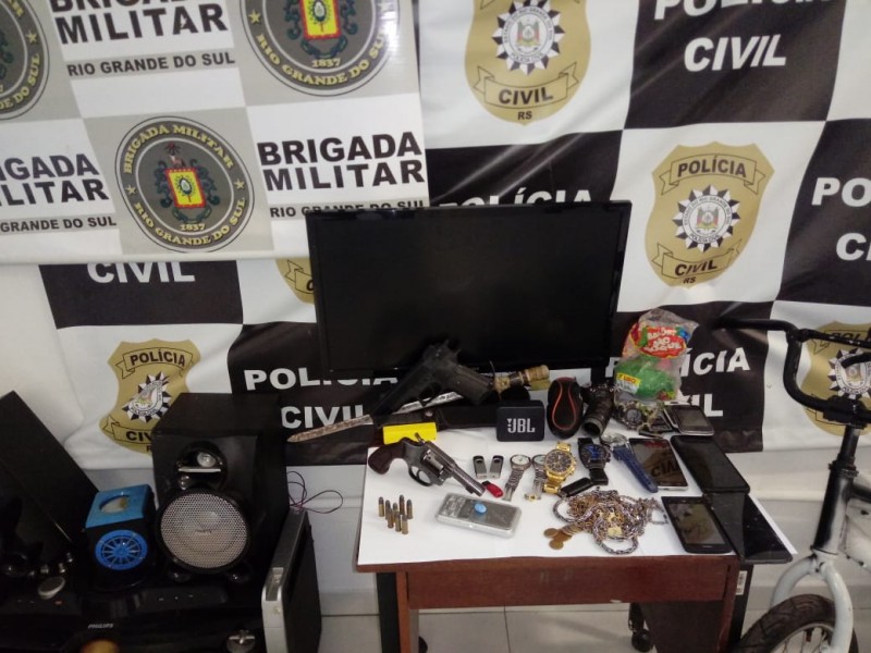 Em outro local foram presos dois indivíduos, pois foi localizado um revólver cal. 32, marca Rossi que encontra-se no sistema como furtado. Além sete munições cal. 32, marca SBC e uma munição cal. 32, marca SP, um simulacro de pistola na cor preta, uma bucha de cocaína, pesando 0,55 gramas, uma balança de precisão, seis celulares sete relógios de pulso e diversos objetos.