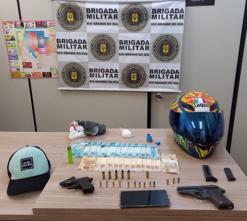 Em revista veicular foi localizado, duas pistolas, 13 munições intactas de calibre 22, três munições íntegras de calibre 38, dois cartuchos deflagrados, uma munição intacta de calibre 9 milímetros, uma quantia em dinheiro em espécie, uma porção de cocaína, um aparelho telefônico e um capacete de motociclista.