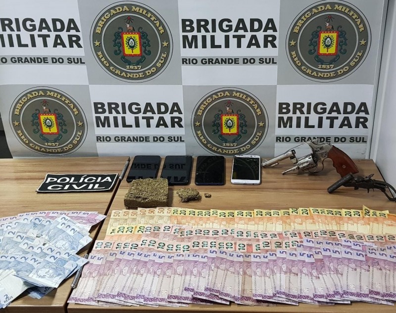 O homem, de 57 anos, foi preso em flagrante por posse irregular de arma de fogo e por tráfico de drogas e encaminhado à Penitenciária Estadual de Venâncio Aires (PEVA) e uma mulher, de 20 anos, foi presa por tráfico de drogas.