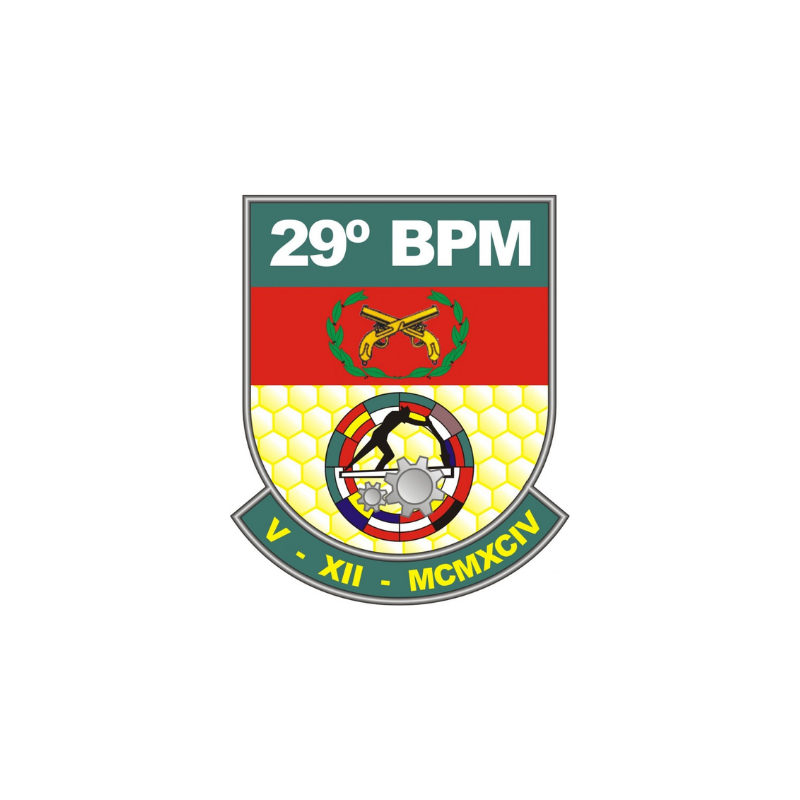 I - escudo em estilo Português, trazendo as cores da Bandeira do Estado do Rio Grande do Sul, com borda prateada em relevo, tendo em sua base a inscrição em algarismos romanos da data de instituição do 29° BPM, 5 de dezembro de 1944. No coração, Pistolas de Clark laureados por ramos de louro, tendo abaixo o conjunto formado pelas bandeiras dos países que representam as 11 etnias e mais os riograndenses nativos que colonizaram a região do 29° BPM, as quais ornam a estátua do lavrador baseado sobre suas engrenagens,