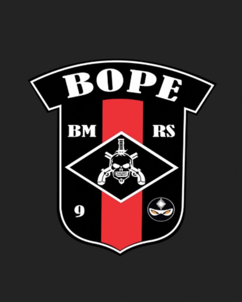 Estilo português de fundo negro, com borda em branco, tendo ao centro, de cima para baixo, faixa em vermelho; ao centro do escudo, sobre a faixa em vermelho, losango de fundo negro, com borda em branco, contendo um crânio humano, transpassado, de cima para baixo, por um punhal “Fairbairn-Sykes”, estando este conjunto sobreposto às “Pistolas de Clark”, todos os elementos em branco; no campo principal acima do losango, as inscrições, em branco e fonte Arial, “BM” à destra e “RS” à sinistra; ainda no campo principal, abaixo do losango, a inscrição, em branco e fonte Arial, “9” à destra e o rosto de uma figura humana coberto por balaclava à sinistra; conjunto do brasão com seus elementos encimado por listel, também de fundo negro com borda em branco, com a inscrição “BOPE” em branco e fonte Arial;