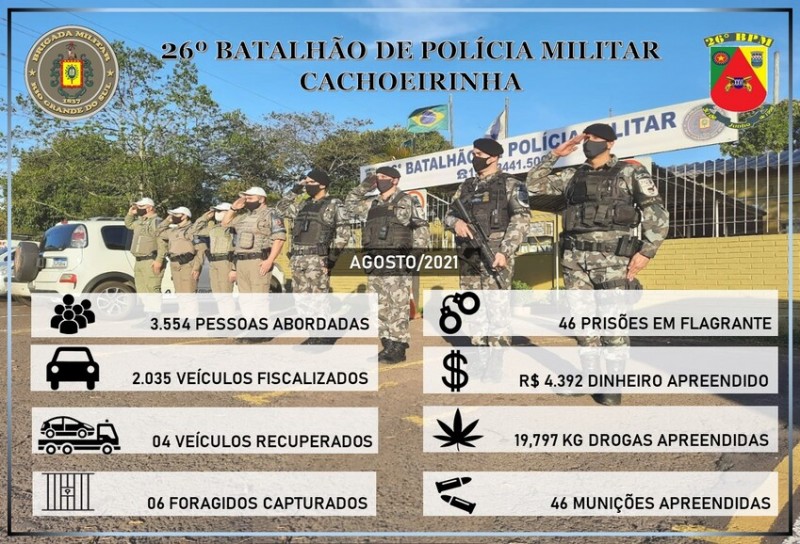 Ao longo do mês de agosto de 2021 foram realizadas 46 prisões em flagrante delito, 19,797 kg de drogas e R$ 4.392 reais foram apreendidos, 06 foragidos foram capturados, 04 veículos recuperados e 46 munições foram apreendidas. Além disso, 3.554 pessoas foram abordadas e 2.035 veículos foram fiscalizados.