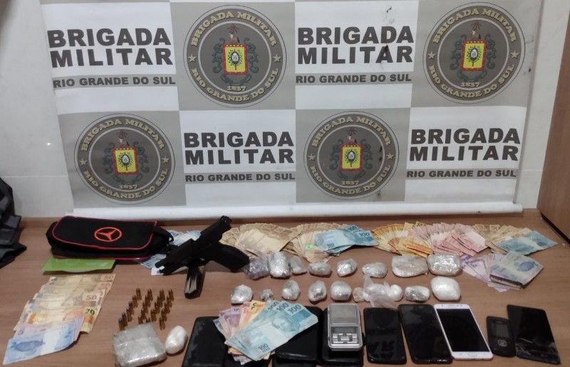 Na noite deste sábado (22/8), no Bairro Costa Sul, a Brigada Militar de Santa Cruz do Sul, em trabalho conjunto da força tática com o setor de inteligência do 23° Batalhão e Comando Regional de Polícia Ostensiva do Vale Rio Pardo, prendeu seis indivíduos por tráfico de drogas e porte de arma de fogo. Os indivíduos, um de 32 anos, que fazia uso de tornozeleira eletrônica, outro de 30 anos, 34 anos, 57 anos, 22 anos e 31 anos, todos com passagem pela justiça. A prisão ocorreu, após um levantamento das equipes de inteligência que levaram policiais militares a abordar os indivíduos em um conhecido ponto de tráfico. Durante abordagem, foi apreendido em posse do homem de 32 anos, uma pistola Cal. 9mm, carregada e municiada, além do valor de R$ 3.972,00, duas porções de cocaína e quatro porções de maconha. Com os demais indivíduos foi apreendido 340,5 gramas de maconha, 61,3 gramas cocaína, 7,6 gramas crack, quatro munições de revólver cal. 32 e R$ 1.281,00 reais. No local, ainda foi apreendido um fardamento camuflado, similar ao usado pela Brigada Militar, duas balanças eletrônicas de precisão, sete telefones celulares de diversas marcas e modelos, uma bateria de tornozeleira eletrônica. Diante dos fatos, foram presos e conduzidos a Delegacia de Polícia para registro e providências. Durante a apresentação na Delegacia, um dos indivíduos passou mal, e foi encaminhado ao Hospital Santa Cruz para atendimento.