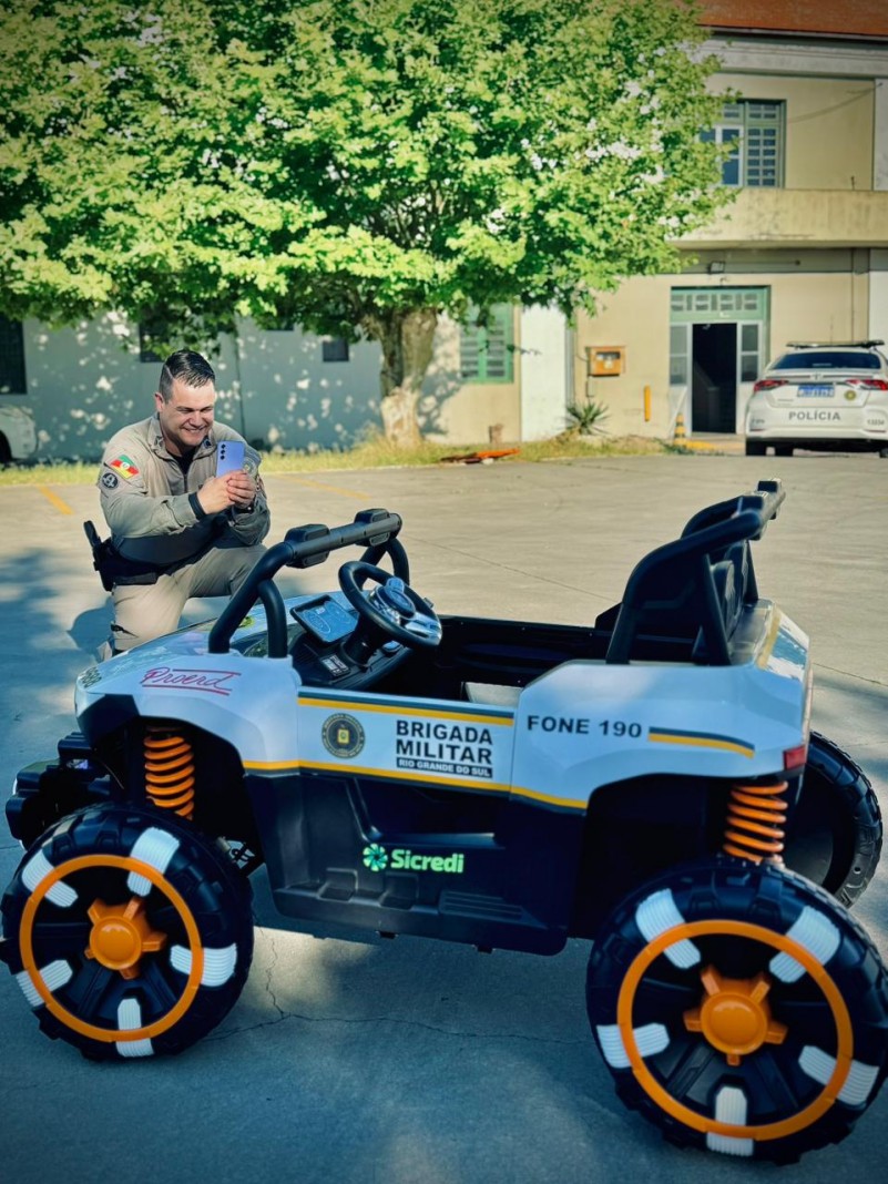 As devolutivas recebidas pelas equipes do Programa Educacional de Resistência às Drogas e à Violência, o Proerd, inspira ainda mais a criatividade dos policiais militares. Tanto que, em 08 de dezembro, houve o lançamento da Viatura Kids para aproximar a Instituição dos pequenos cidadãos de maneira lúdica, segura e educativa. “A viatura proporciona às crianças a possibilidade de realizarem um sonho que muitas delas expressaram,” explicou o Soldado PM Rafael Magalhães. A nova ferramenta de trabalho deve ser utilizada em eventos, formaturas, atividades escolares e demais ações comunitárias da Brigada Militar. Embora não seja uma viatura operacional, ela representa a “viatura oficial das crianças”, permitindo que elas vivenciem momentos divertidos e criativos, sempre acompanhados pelos instrutores do Proerd.