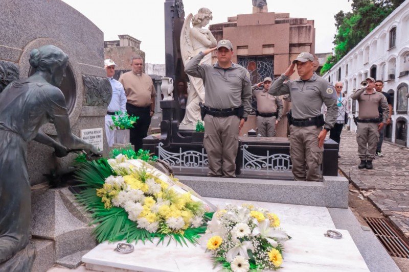 A Brigada Militar realizou, nesta quinta-feira (16/10), uma homenagem aos 160 anos de nascimento do Coronel Emílio Afonso Massot, o Patrono da Brigada Militar, no Cemitério da Santa Casa. O Comando-Geral da Brigada Militar e a Legião Altiva participaram da solenidade, entre outras autoridades militares e civis. Além das honras militares, duas suntuosas coroas de flores ornamentaram o jazigo.