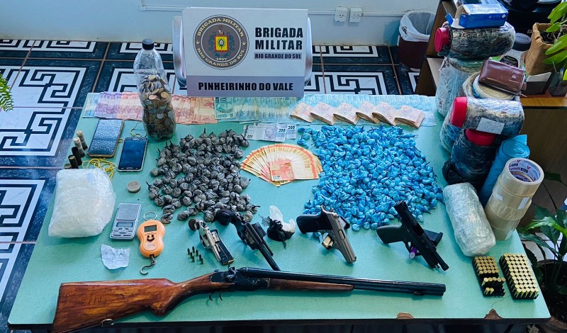 A prisão foi realizada após levantamento de informações pelos agentes de inteligência da Brigada Militar, e após abordagem policial aos envolvidos foi apreendido os seguintes materiais: uma espingarda calibre 16, uma pistola bersa calibre 9mm, uma pistola bersa thunder calibre 380, um revólver calibre 38, um revólver calibre 22, cinco cartuchos calibre 16, 117 munições de variados calibres, 602 buchas cocaína, prontas para a venda, dois invólucros de pasta base de cocaína pesando aproximadamente 2277 Gr, duas balanças de precisão, usadas para pesar o entorpecente, alem de 05 celulares e R$11.330,00 (onze mil trezentos e trinta reais).