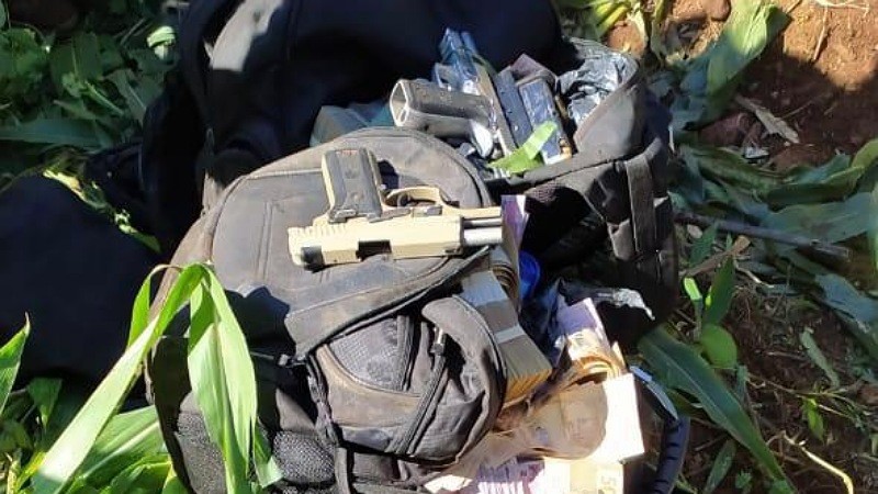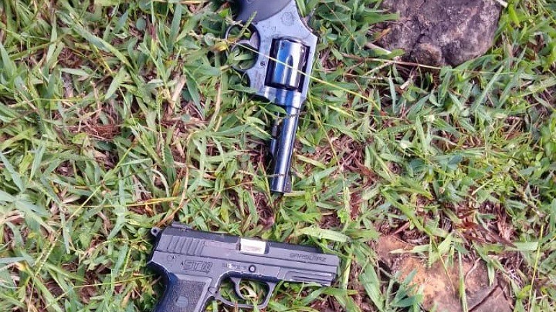 Com o preso, V. M. líder da quadrilha, foram apreendidos uma pistola e dois revólveres dos vigilantes do banco, com A. L. S. S. e R. S. L. mortos, foram apreendidas duas pistolas e uma quantia em dinheiro roubada da agência.