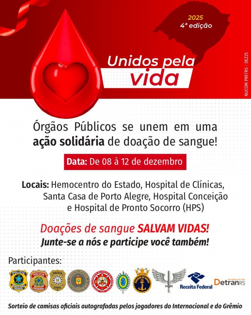 A Brigada Militar participará, de 8 a 12 de dezembro, da 4ª edição da campanha “Unidos pela Vida”, organizada pela Polícia Rodoviária Federal (PRF), iniciativa que tem como objetivo incentivar a doação de sangue e reforçar os estoques dos principais hemocentros e hospitais de Porto Alegre.