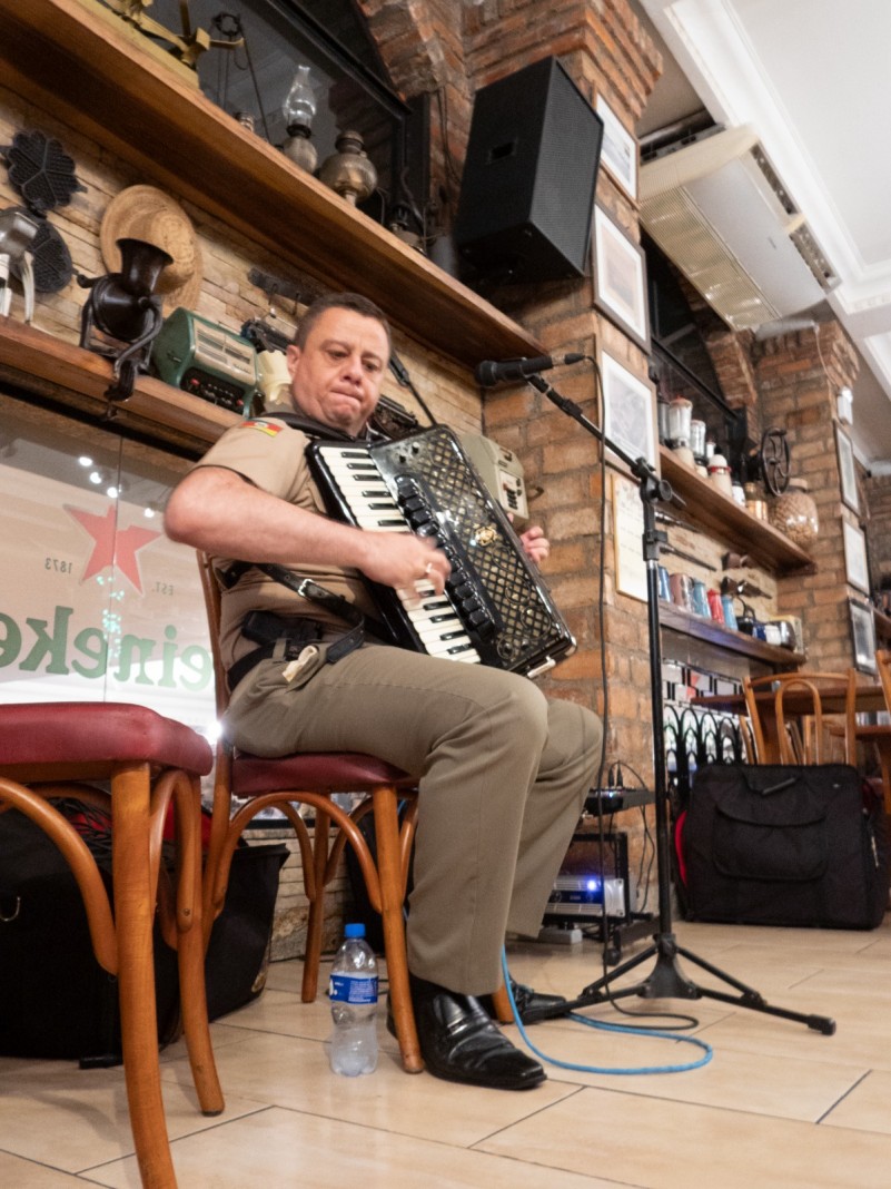 - Foto: Sd PM William PM5Emocionado por conhecer pessoalmente os ídolos musicais, em especial Beto Caetano, o brigadiano escolheu para apresentar com a sua gaita pianada quatro músicas, sendo duas delas de Tio Bilia. “Escolhi músicas que marcaram a minha vida. A do Casório do Batista fala de um casamento que meu vizinho foi, o centenário Pedro Prestes, e depois me contou que o Tio Bilia estava tocando lá e disse que faria uma música,” recordou.