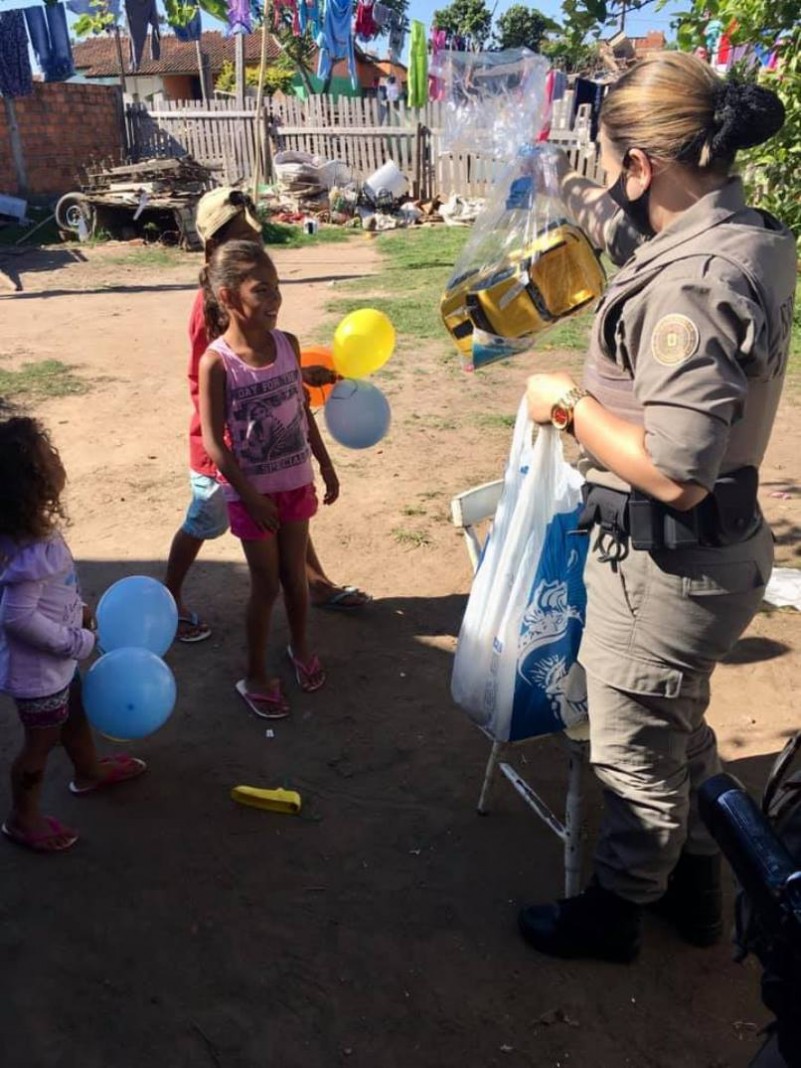 Os policiais militares da patrulha realizaram a distribuição dos brinquedos em vários bairros de Santa Maria e na ocasião também foram entregues kits de doces e um delicioso lanche.