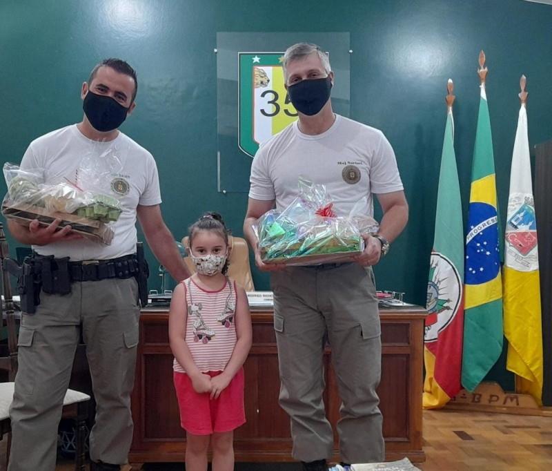 O Comandante do 35? batalhão de polícia Militar, major Rodrigo Righes Sartori, e o sargento Lucas Bauer dos Santos receberam na tarde desta quarta-feira (23/12), na sede do Batalhão, Suzimar e Sofia Cassol.