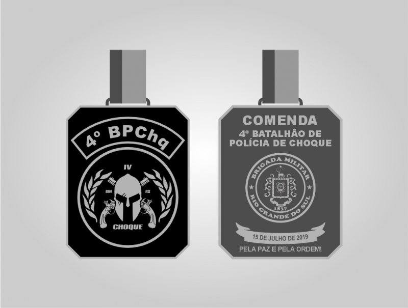 Art. 4º A Comenda é composta, no anverso, pelo Brasão de Armas do 4º BATALHÃO DE POLÍCIA DE CHOQUE DA BRIGADA MILITAR no verso conterão na parte superior as inscrições “BRIGADA MILITAR”, na parte central, “COMENDA DO 4º BATALHÃO DE POLÍCIA DE CHOQUE” e na parte inferior o ano de concessão da honraria, sendo o metal pendente de uma fita achamalotada em duas linhas alternadas e de igual largura, nas cores preto e cinza.