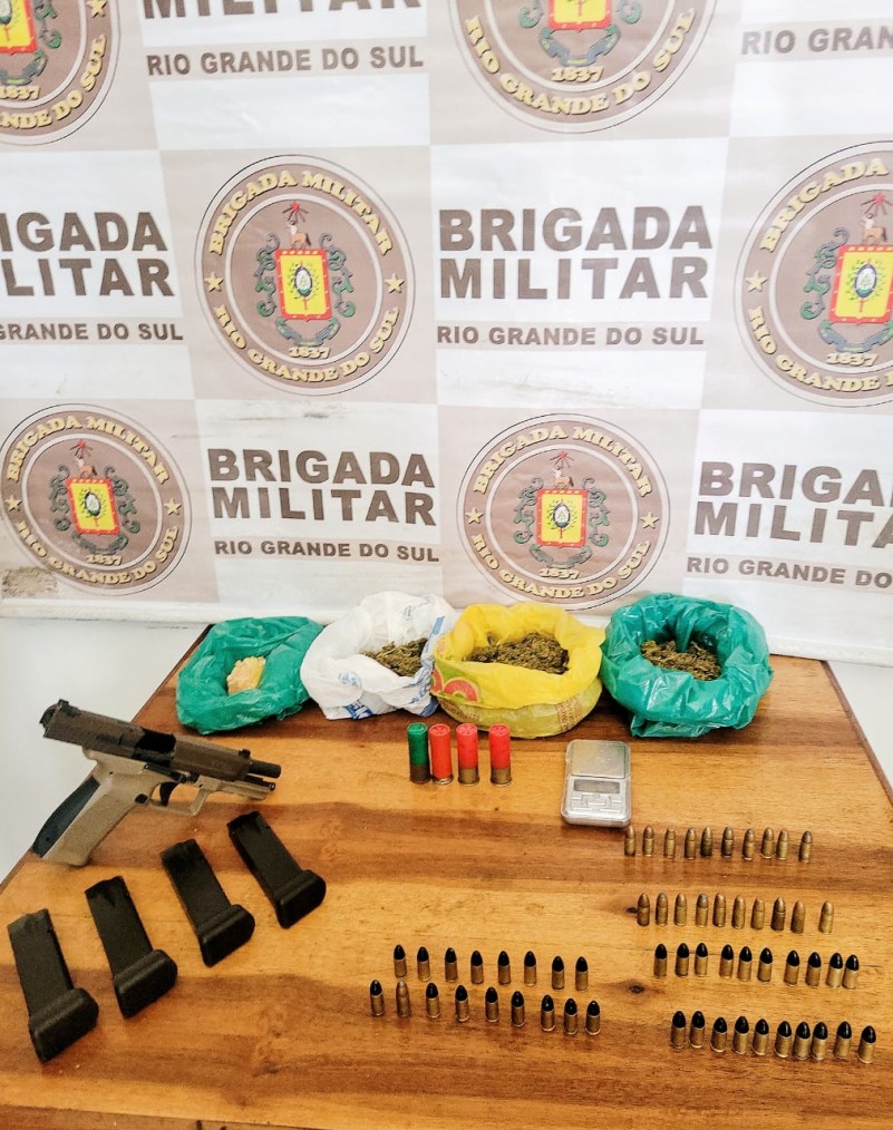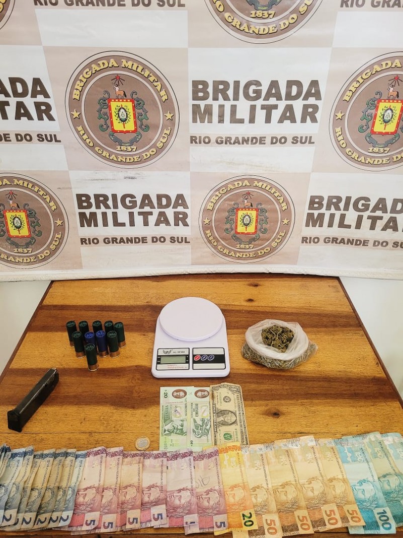 Com ele foi encontrado, dinheiro em espécie, uma balança de precisão, um carregador de pistola, 22 munições calibre 12 e uma quantia em maconha.