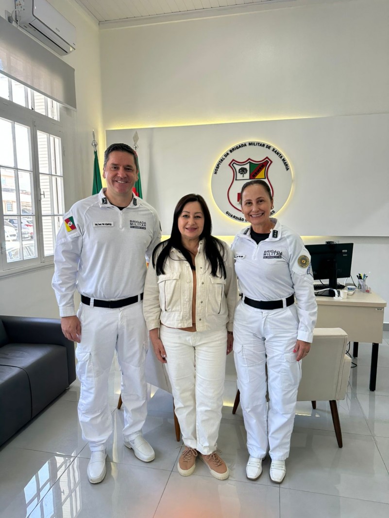 Na foto acima, estão a Diretora-Geral do HBMSM, Tenente-Coronel Enfermeira PM Nina Rosa Budel, o Chefe do Apoio Técnico, Major Dentista PM Rodrigo Kempfer, e a assistente social Joicelaine Gonçalves, que já atuou anteriormente no hospital e conhece de perto as demandas e necessidades da família brigadiana.