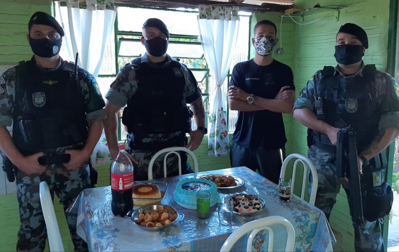 Na tarde de sábado (1/8), a Brigada Militar de Cachoeira do Sul realizou uma surpresa de aniversário para Kauê Fagundes, que completou 18 anos. O pai de Kauê, senhor Nilton Trindade, entrou em contato com a guarnição da Força Tática (FT), pedindo para que os policiais militares, durante o serviço, pudessem parabenizar o jovem, que é admirador da Instituição.