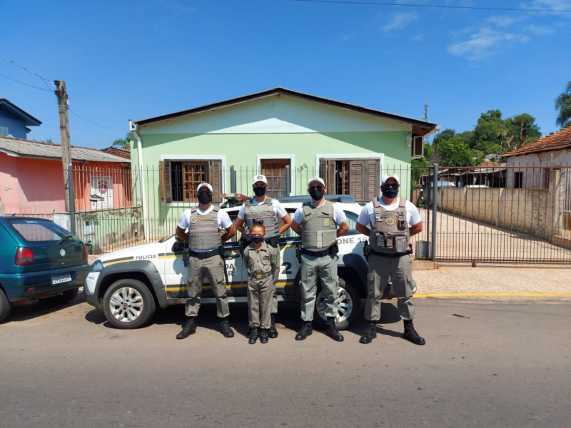 Na manhã de quarta-feira (2/12), em Rio Pardo, durante patrulhamento ostensivo no emprego operacional dos alunos soldados, o tenente Tiago da Silva Mathias, Comandante do Corpo de Alunos do Polo de Ensino do Vale do Rio Pardo e instrutor dos estágios, acompanhado dos alunos Helfer, Lucas e Silva, realizaram a entrega de um fardamento infantil à menina Helena, que já havia recebido a visita dos policiais no mês de novembro e nutre o sonho de ser policial militar.